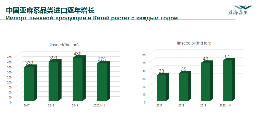 据他介绍,如果中国在2017年购买了33.9万吨亚麻籽,那么到2019年,这一数字将增加到43万吨。到2020年的11个月中,油籽进口量达到37.5万吨。