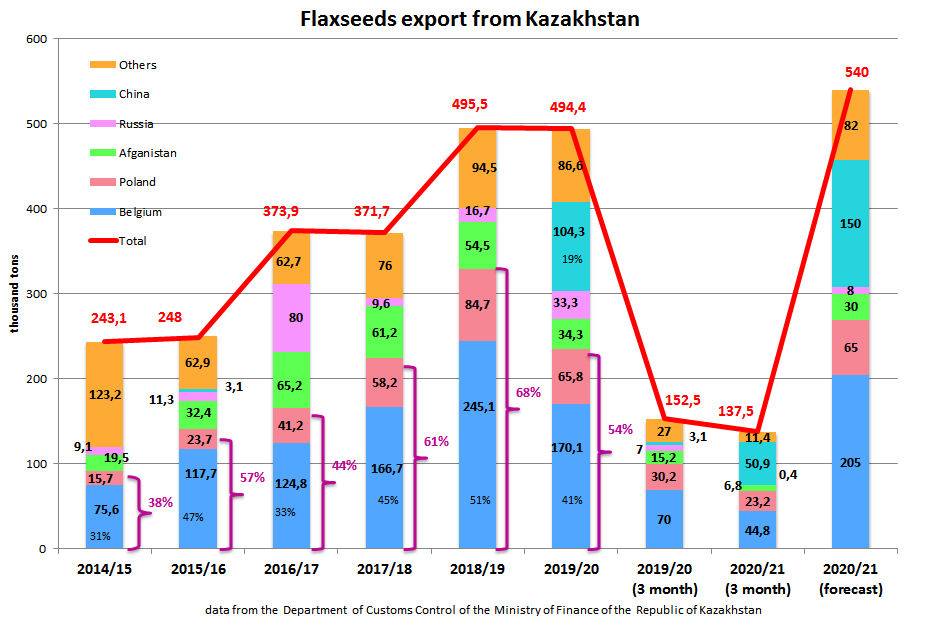 专家补充说:“按照我们的预期,本季度将从哈萨克斯坦出口超过50万吨的亚麻籽,其中15万吨可以运往中国。”