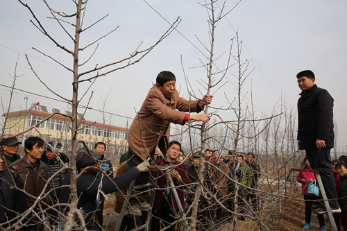 教授给乡土技术学员示范矮砧苹果春季修剪。
