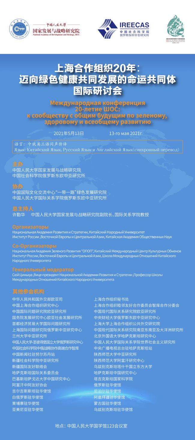 2021年是上海合作组织成立二十年。在全球疫情与百年变局相互交织的背景下,上合组织的持续发展面临着新形势和新挑战。为贯彻落实习近平主席倡议构建上合组织“四个共同体”的精神,赋予上合组织的“上海精神”新内涵,中国人民大学国家发展与战略研究院与上海合作组织睦邻友好合作委员会智库分委会主席单位中国社会科学院俄罗斯东欧中亚研究所,定于5月13日下午15:00-17:35在共同举办主题为“上海合作组织20年:迈向绿色健康共同发展的命运共同体”国际研讨会。