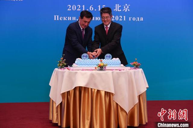 图为中国外交部副部长乐玉成与上合组织秘书长诺罗夫共切庆祝蛋糕。 中新社记者 蒋启明 摄
