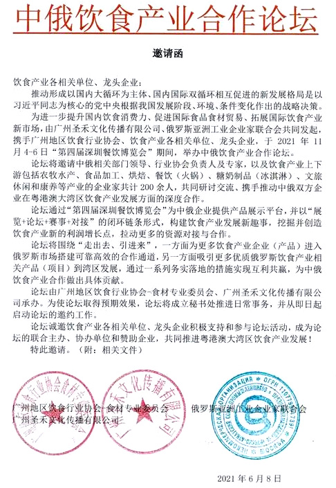 2021年11月4-6日,在第四届深圳餐饮博览会期间,将由广州地区饮食行业协会、广州圣禾文化传播有限公司、俄罗斯亚洲工会企业家联合会共同发起,携手中俄两国餐饮及食材品牌资源,搭建了国际饮食合作交流展区,20000㎡的展区面积,以展览+论坛+赛事+对接的闭环链条形式,适应深圳及大湾区餐饮市场多元化的发展需求,覆盖餐饮产业每一块链条,整合全行业的资源,挖掘并创造饮食产业新的利润增长点,加速推进饮食产业标准化建设,拉动更多的资源对接与合作,为餐饮行业带来更多的可能性。
