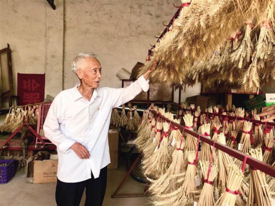 6月11日,宝鸡扶风豆村农场选种室里,86岁的赵瑜研究员正在查看筛选出来的小麦新品种麦穗。