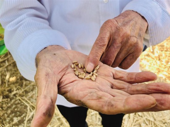 6月11日,宝鸡扶风豆村农场试验田里,86岁的赵瑜研究员手捧刚刚通过“国审”的小麦新品种麦粒。