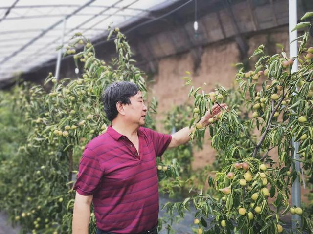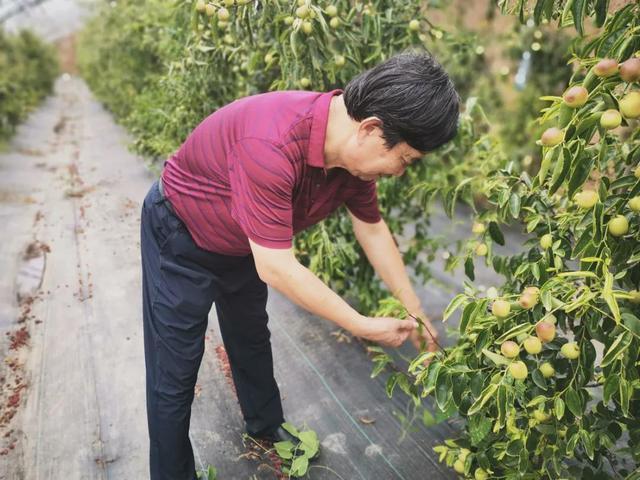 公司董事长徐社德早早来到大棚内,弯着腰,查看冬枣长势。
