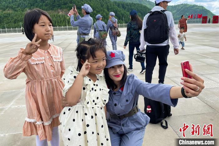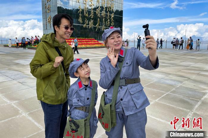 在六盘山红军长征纪念馆外,穿上红军服的外国专家与中国小孩合影留念。 李佩珊 摄