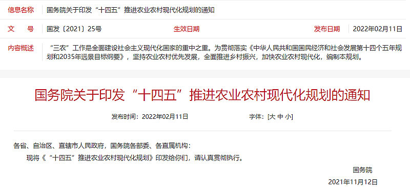 2月11日,国务院印发《“十四五”推进农业农村现代化规划的通知》,明确将上海合作组织农业技术交流培训示范基地建设相关内容列入其中。