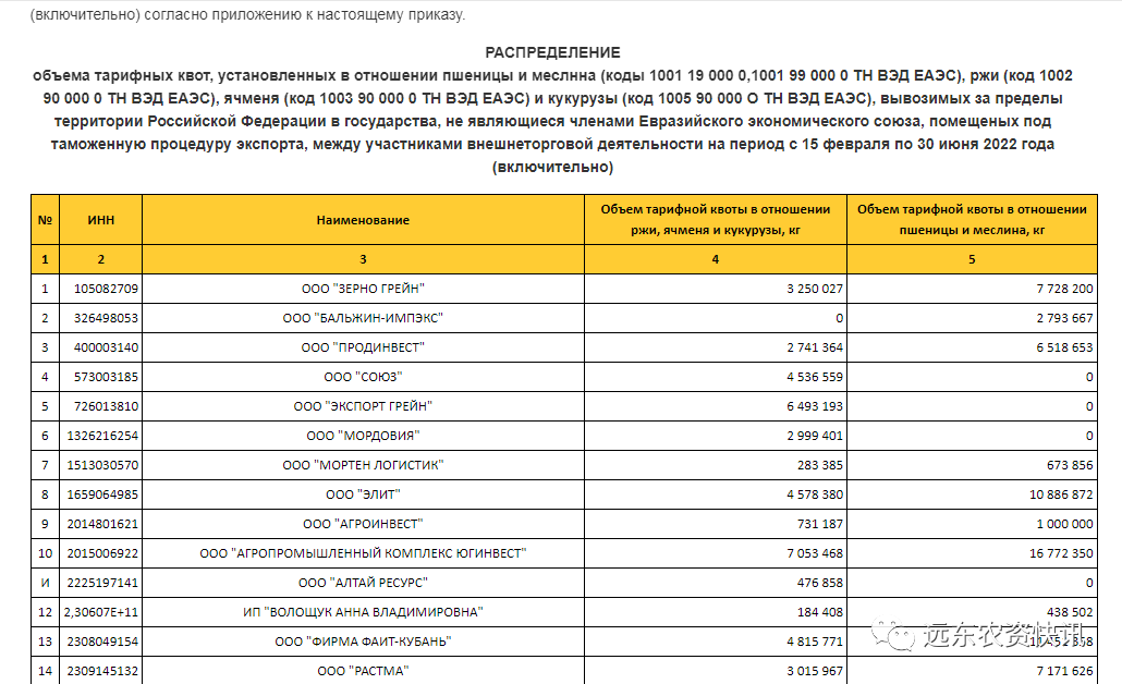 自2月15日至6月30日期间,俄罗斯粮食出口配额总量为1100万吨。其中,小麦800万吨。黑麦、大麦和玉米为300万吨。配额内,将继续采取现行的“弹性出口关税机制”。配额外,将征收50%的出口关税,但每吨不低于100 欧元。但对欧亚经济联盟国家(俄罗斯、哈萨克斯坦、白俄罗斯、吉尔吉斯斯坦和亚美尼亚)出口将不受配额限制。
