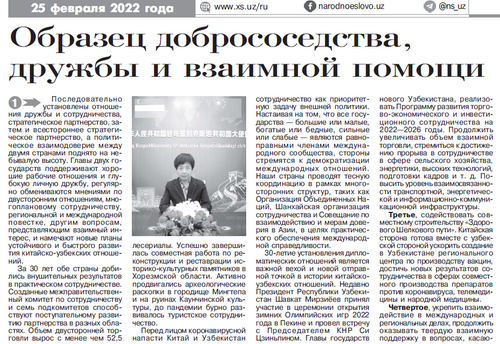 2022年2月25日,驻乌兹别克斯坦大使姜岩在乌《人民言论报》发表署名文章《风雨兼程三十载,携手迈向新时代——守望相助、睦邻友好的典范》,全文如下: