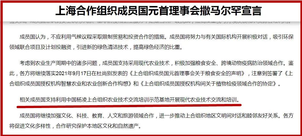 从2019年6月14日,国家主席习近平在上海合作组织成员国元首理事会第十九次会议上提出“中方愿在陕西省设立上海合作组织农业技术交流培训示范基地”的倡议,到2020年10月22日上合农业基地挂牌,从2020年11月10日《莫斯科宣言》到今天的《撒马尔罕宣言》,从“成员国注意到中华人民共和国关于在杨凌设立上合组织农业技术交流培训示范基地的倡议”,到“相关成员国支持利用中国杨凌上合组织农业技术交流培训示范基地开展现代农业技术交流和培训”,世界各国见证了中国推动构建人类命运共同体的中国方案。