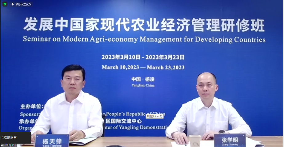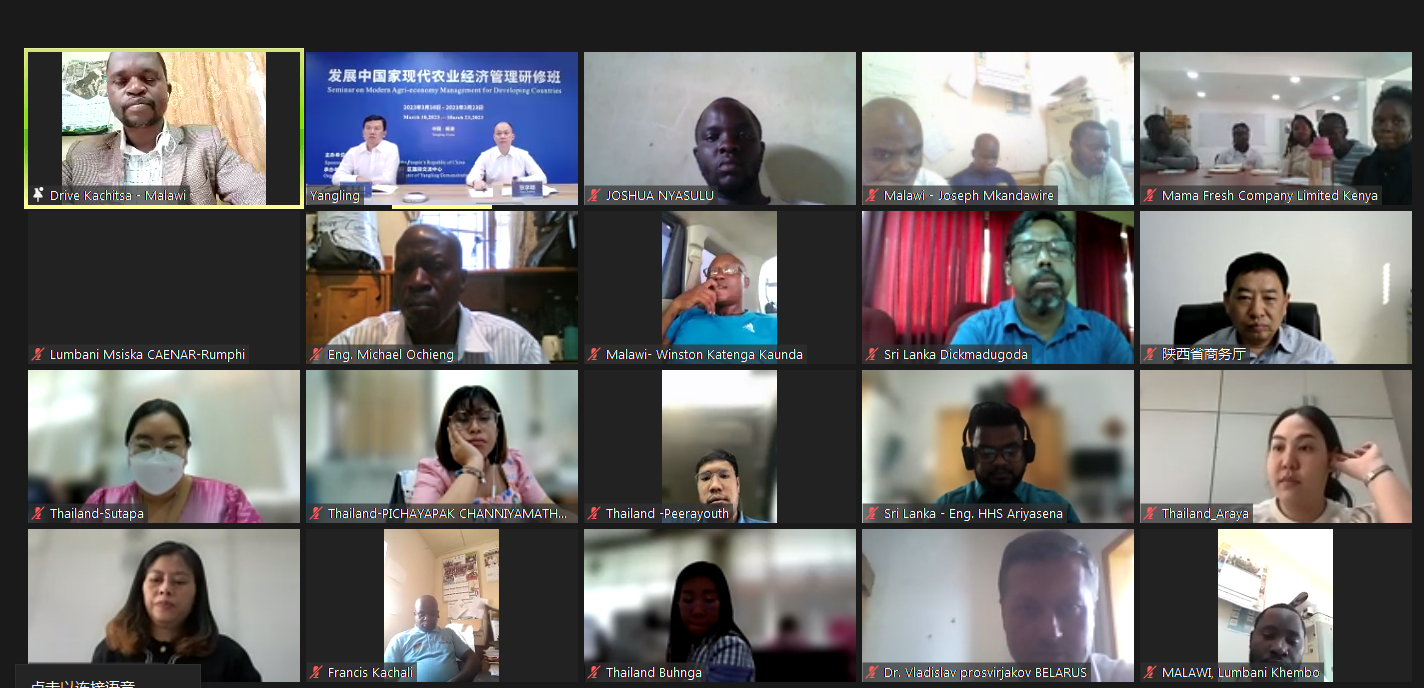 3月10日,由中华人民共和国商务部主办,杨凌示范区承办的发展中国家现代农业经济管理研修班在杨凌开班。陕西省商务厅、杨凌示范区管委会等相关单位领导出席开班仪式并致辞。来自马拉维、肯尼亚、斯里兰卡、泰国、乌兹别克斯坦、赞比亚等16个国家的84名学员线上参加开班仪式。
