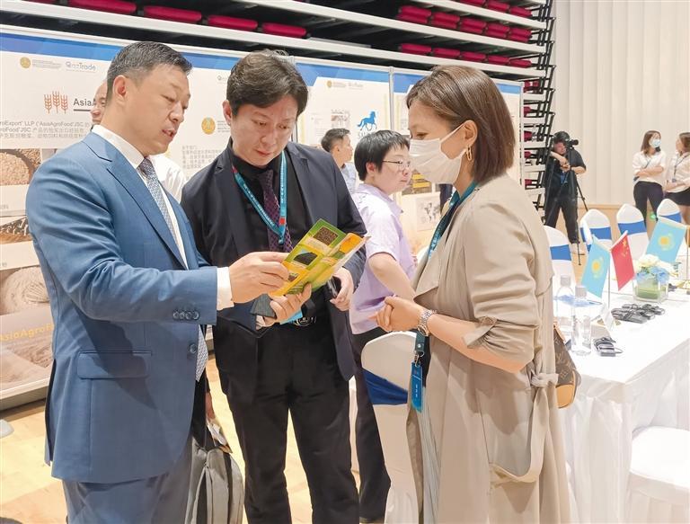 五月十七日,在中国—哈萨克斯坦商品展上,何诚(左一)在介绍哈萨克斯坦产品。