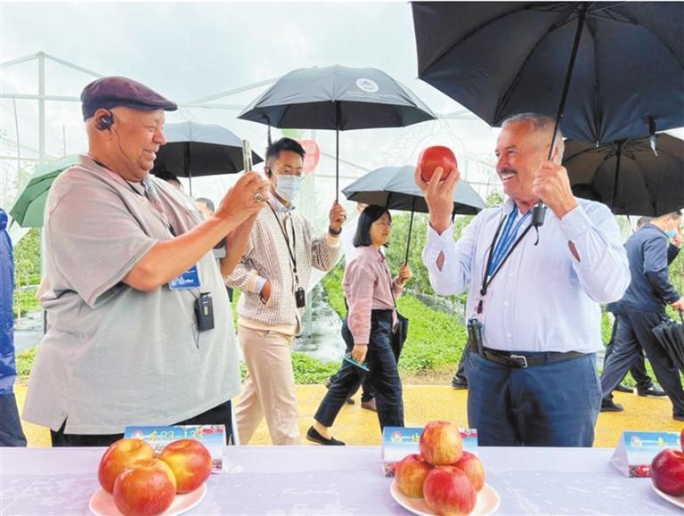5月31日,上海合作组织减贫和可持续发展论坛考察团嘉宾在国家级洛川苹果科技创新中心察看果业发展情况。 陕西日报记者 陈宏江 摄