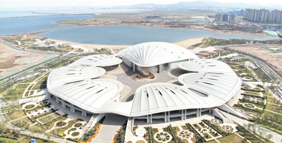 5月22日,人们在位于上海合作组织示范区的青岛·上合之珠国际博览中心合影留念。