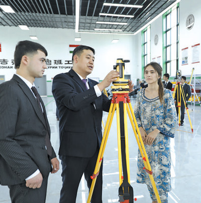 4月12日,在塔吉克斯坦首都杜尚别的鲁班工坊内,来自天津城市建设管理职业技术学院的老师吴正鹏(左二)向学生讲解测绘仪器使用方法。