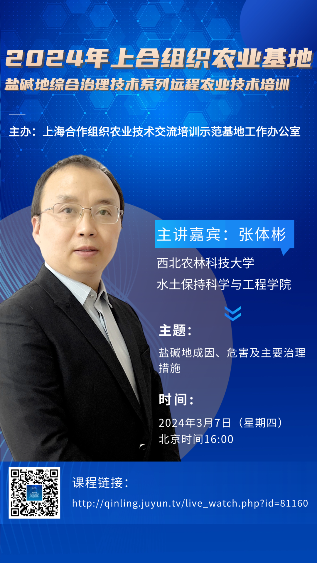 2024年上海合作组织农业技术交流培训示范基地将持续发挥平台作用,面向上合组织国家开展盐碱地综合治理技术系列远程培训,内容涵盖土壤盐渍化现象、成因与危害,土壤盐渍化诊断方法,盐碱地灌溉管理,盐碱地综合治理相关理论和技术,盐碱地治理案例分析等。第二期主题培训--盐碱地成因、危害及主要治理措施将于3月7日上线。具体时间:2024年3月7日(星期四)北京时间16:00
