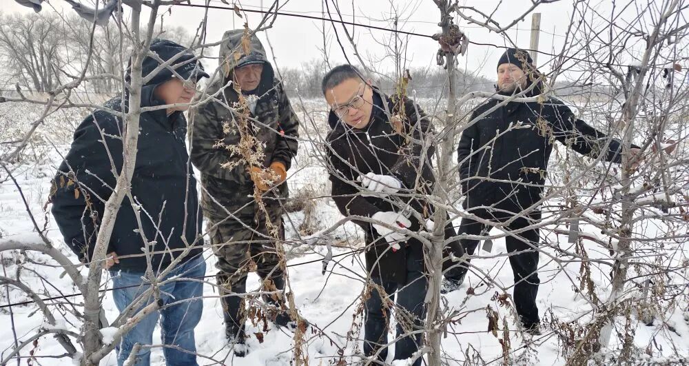 2024年12月8日,西北农林科技大学教授张东(右二)在吉尔吉斯斯坦楚河州的中吉果木良种繁育示范园进行冬季苹果苗木修剪技术培训。