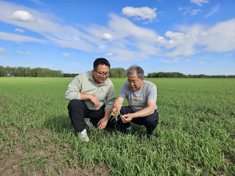 2024年6月19日,西北农林科技大学教授张正茂(右)与学生在哈萨克斯坦北哈州的农业示范园调查小麦生长情况。