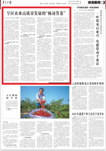 7月29日,在杨凌示范区成立28周年之际,《农民日报》3版头条刊发主题报道《旱区农业高质量发展的“杨凌答卷”》,聚焦杨凌示范区依托省部共建和区校融合优势,与西北农林科技大学等驻区单位深化协同创新,通过350余个农业科技示范推广基地,将新品种、新技术、新模式推向全国,为现代农业高质量发展描绘了一幅新蓝图的生动实践。
