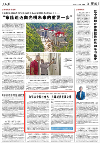 在上海合作组织农业技术交流培训示范基地重大倡议提出6周年之际,6月8日,《人民日报》3版头条刊发主题报道《打造上海合作组织农业技术合作的“样板间”》,聚焦上合组织农业基地立足上海合作组织国家农业资源禀赋、经济社会发展基础和未来农业发展方向,聚焦“交流、培训、示范”核心功能定位,发挥农业科技合作、人才培育、技术推广、经贸合...